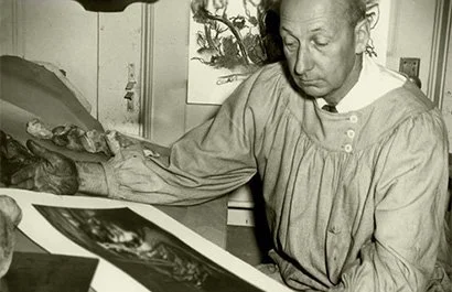 Reed took every chance to travel and follow the trends in art, always drawing and sketching. His journeys took him to Nova Scotia, France and Mexico. During the fuel rationing of WWII, he stayed closer to home and traveled the southwest, spending time in Taos. When he retired in 1959, he moved to there. to spend the remainder of his life. Reed fell in love with the landscape and its people. His work during this time led him to be one of the premier painters and printmakers of his time. He was elected to the National Academy of Design for graphic arts in 1952 and wrote a book called “Doel Reed Makes an Aquatint.”